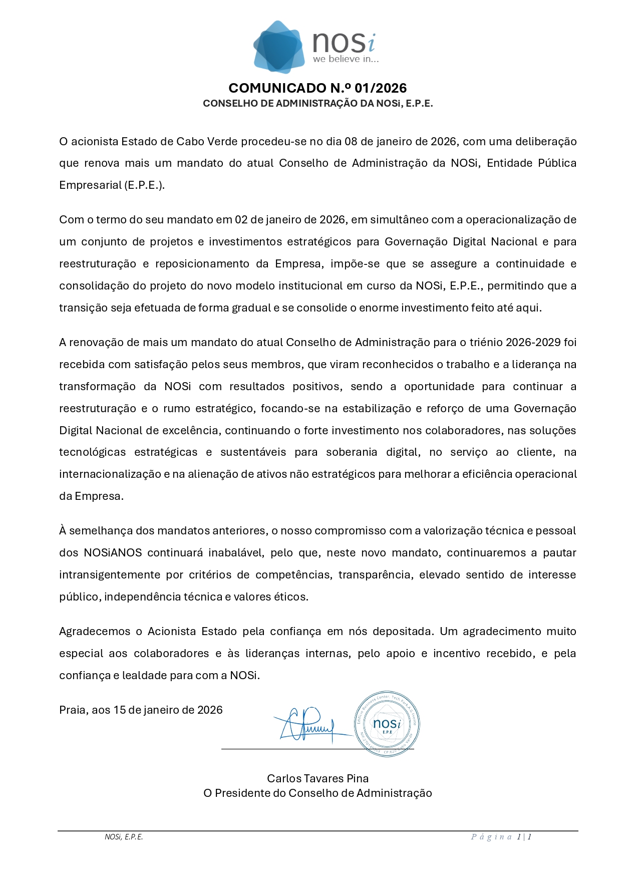 Comunicado sobre a renovação de mais um mandato do atual Conselho de Administração para o triénio 2026-2029, deliberado no dia 08 de janeiro pelo Acionista Estado de Cabo Verde, ao abrigo da alínea b) do artigo 59º e do nº 1 do artigo 61º, do código das Sociedades Comerciais aprovado pelo Decreto Legislativo n.º 2/2019, de 23 de julho, em conformidade com o Despacho Conjunto das duas Tutelas